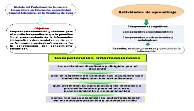 En primer lugar, el estudiante tiene que acceder (buscar) a la información, lo que lleva implícito la búsqueda como procedimiento documental mediante el cual se puede obtener el conjunto de informaciones y documentos necesarios, para resolver cualquier problema de investigación o interrogante que se plantee. En segundo lugar, dominar el trabajo con la información, que sepa manejarla y sea capaz de convertirla en elementos que eleven su cultura y les den solución a sus necesidades informativas. Se busca información para resolver un problema práctico de la vida o un problema de conocimiento. La misma está unida siempre a un fenómeno que se tiene que resolver, en el proceso enseñanza-aprendizaje, todo estudiante tiene que consumir información para realizar sus actividades de aprendizaje y resolver sus problemas.